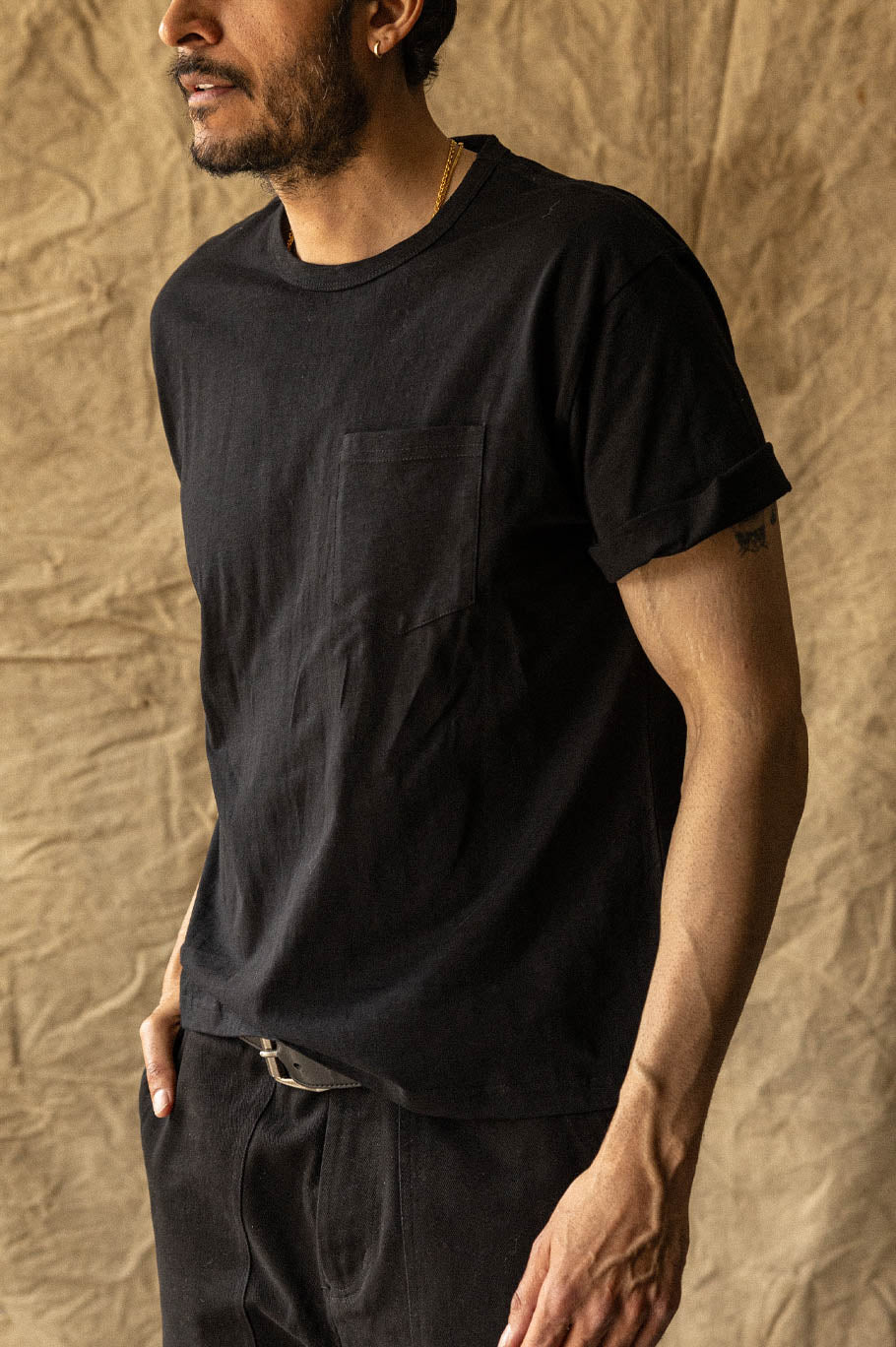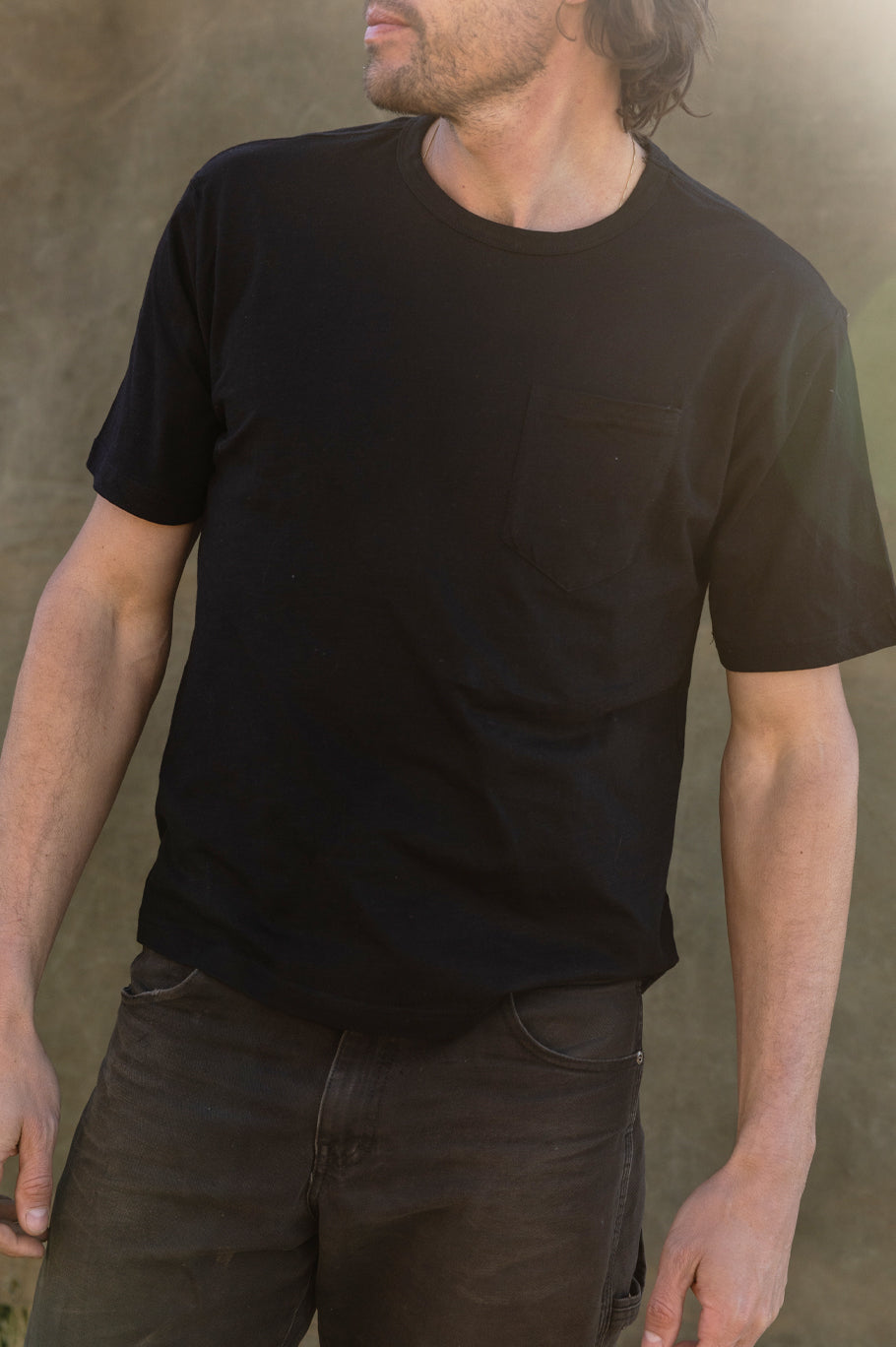 A 100% cotton slub tee with a reinforced front pocket. Fits true to size.