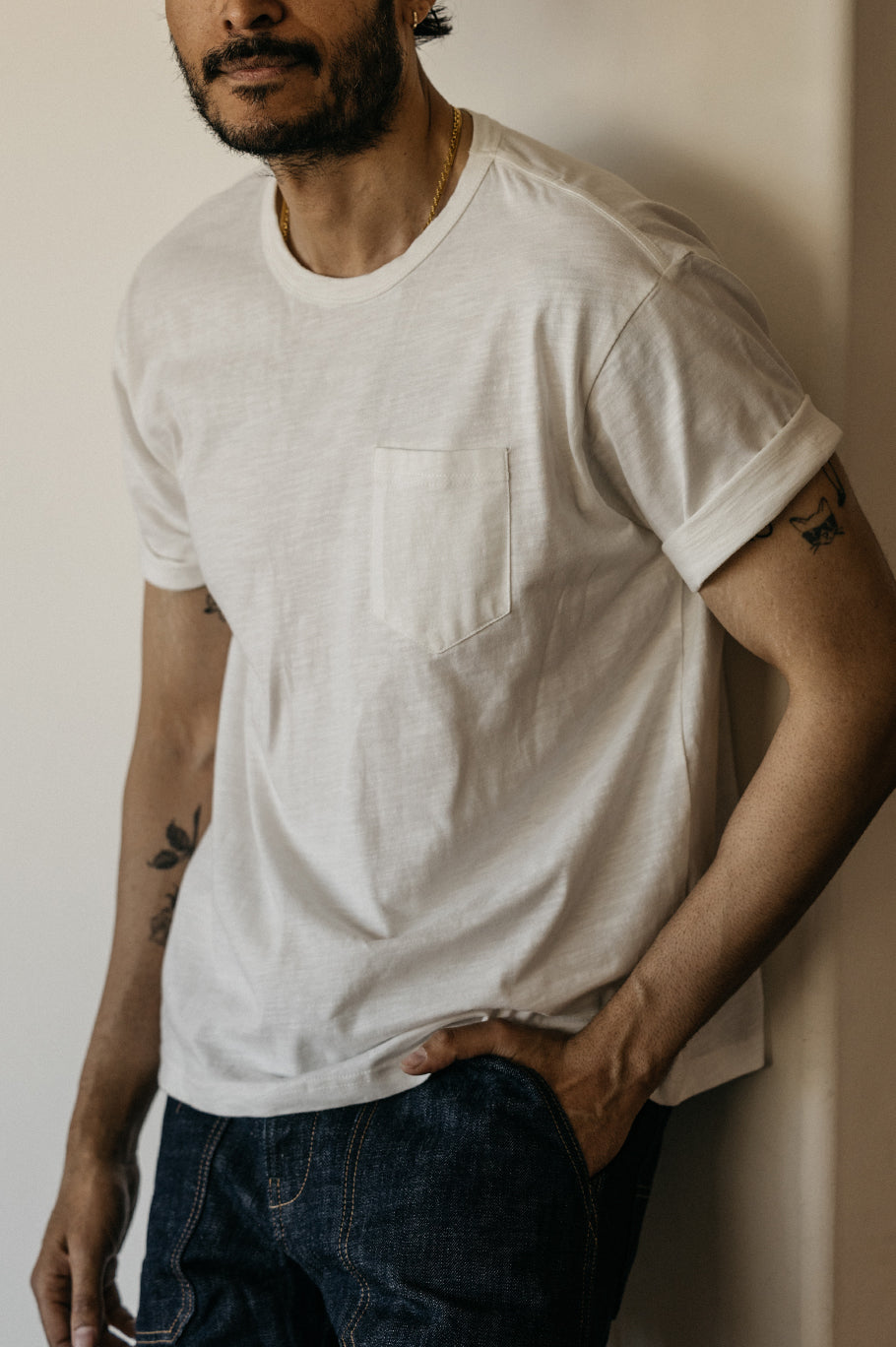 A 100% cotton slub tee with a reinforced front pocket. Fits true to size.
